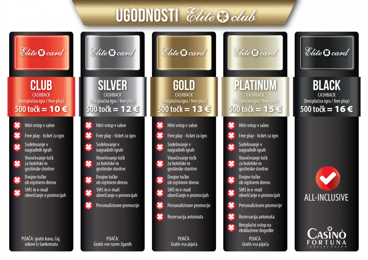 Točke, zbrane s kartico Elite Club, vam bodo prinesle številne različne ugodnosti, kot so gostinske ponudbe, sodelovanje v promocijskih igrah, kuponi za žrebanja, vstopnice na posebne dogodke ter še veliko več. Glede na nivo vašega članstva v Elite Club-u lahko točke zamenjate tudi v igralne lističe (cashback).
